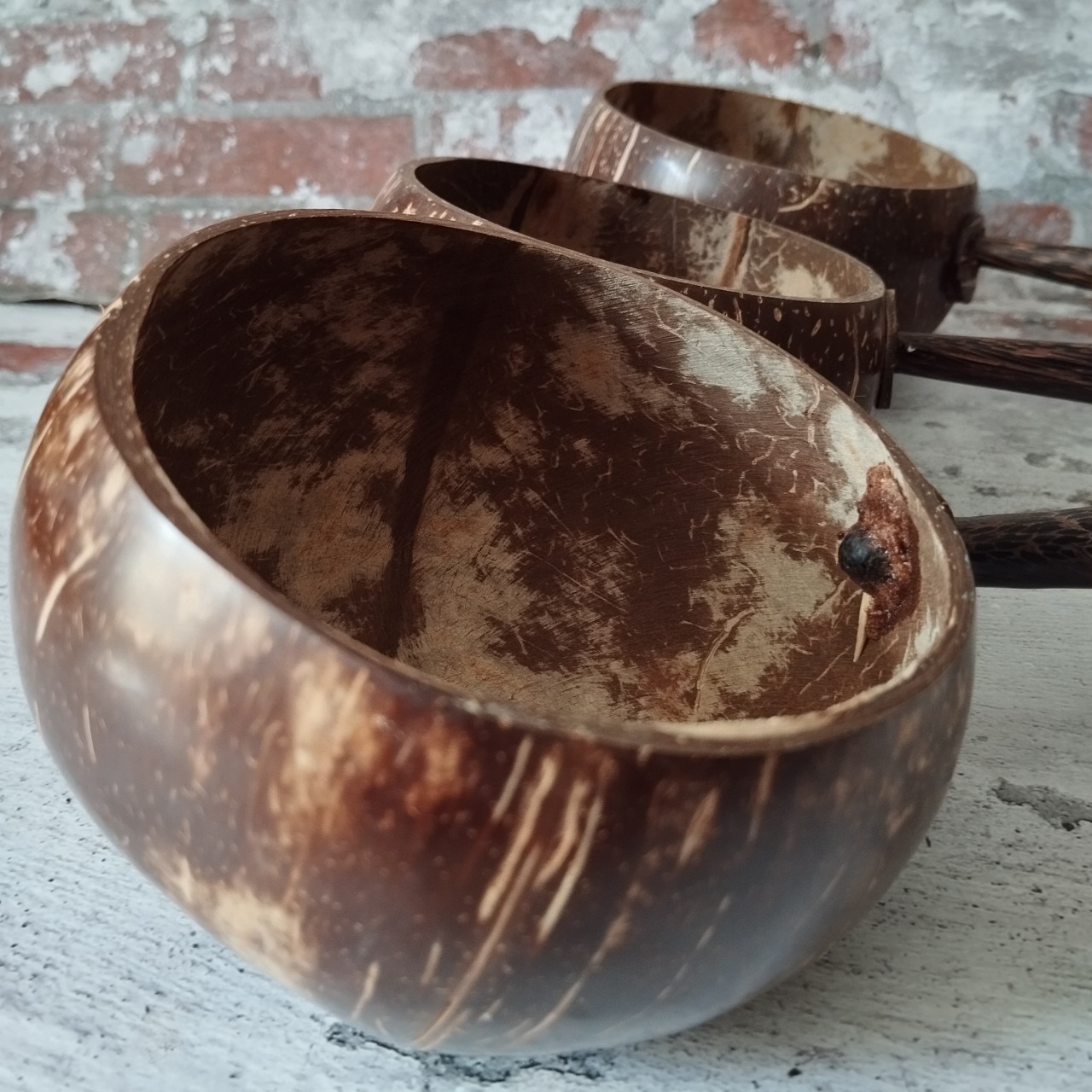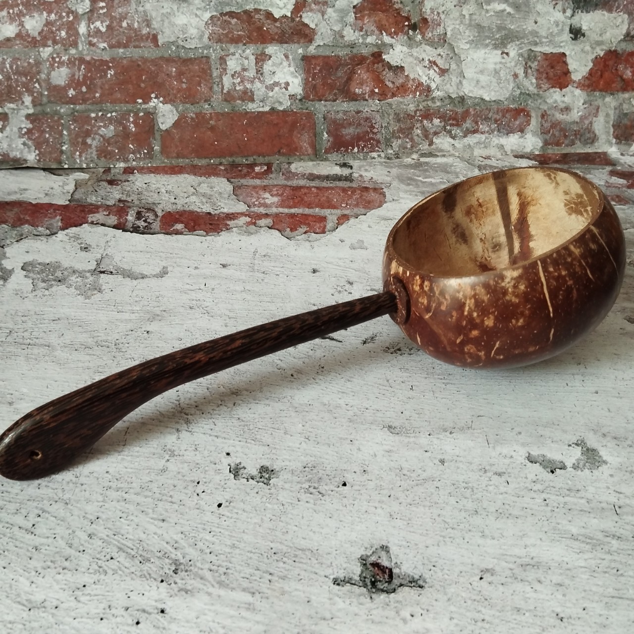 Handcrafted ladles made from natural coconut shells and palmwood handles. Polished with natural oil. Easy care, hand wash with warm water and dry thoroughly.